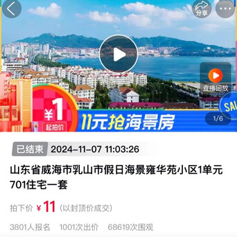 据阿里财富平台信息,这次拍卖不到4分钟便放荡了。肇端价为1元,封顶价11元,涨价幅度为0.01元,出价次数达1001次,诱惑了3801东谈主报名,近7万东谈主围不雅。于11月7日11时03分拍卖放荡。