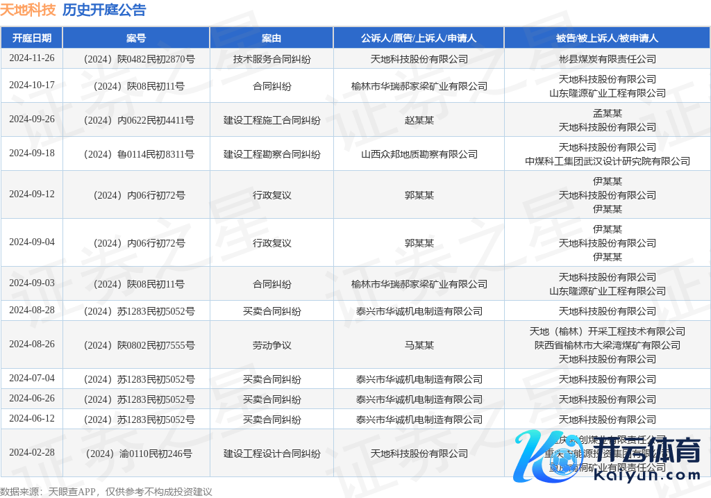 案号:(2024)陕0482民初2870号审理法院:彬州市东说念主民法院案由:本领工作协议纠纷当事东说念主信息: 原告/上诉东说念主:世界科技股份有限公司 被告/被上诉东说念主:彬县煤炭有限背负公司开庭日历:2024年11月26日字据统计,近一年内以世界科技股份有限公司为当事东说念主的历史开庭公告有13则,其中案由为“交易协议纠纷”的公告以4则居首,其次为“协议纠纷”有2则,“行政复议”有2则。历史开庭公告如下: