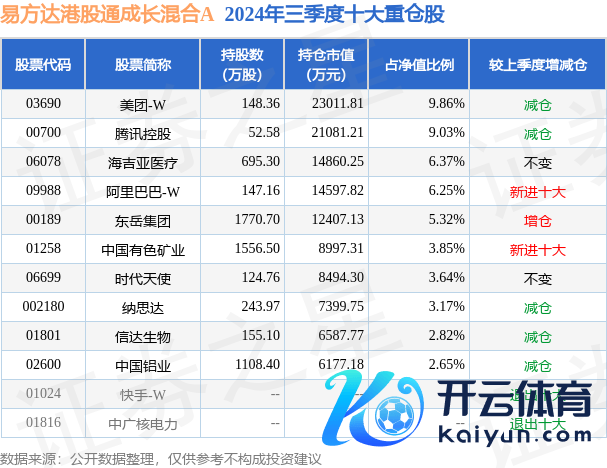本站讯息开云体育,1月7日,易方达港股通成长搀和A最新单元净值为0.5982元,累计净值为0.5982元,较前一交游日着落0.57%。历史数据透露该基金近1个月着落3.7%,近3个月着落13.06%,近6个月着落5.54%,近1年着落9.18%。该基金近6个月的累计收益率走势如下图: 易方达港股通成长搀和A为搀和型-偏股基金,左证最新一期基金季报透露,该基金财富成立:股票占净值比84.19%,无债券类财富,现款占净值比17.06%。基金十大重仓股如下: 该基金的基金司理为陈皓,陈皓于2021年
