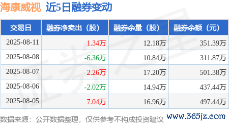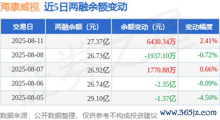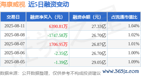 本站讯息,8月11日,海康威视(002415)融资买入1.81亿元,融资偿还1.18亿元,融资净买入6390.81万元,融资余额27.33亿元。