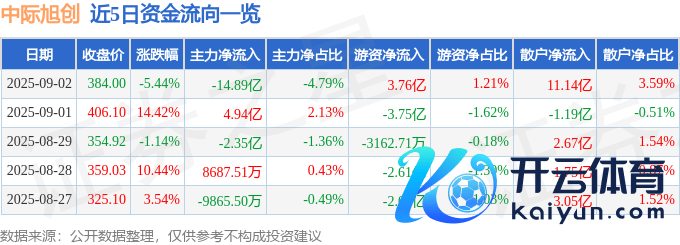 9月2日的资金流向数据方面,主力资金净流出14.89亿元,占总成交额4.79%,游资资金净流入3.76亿元,占总成交额1.21%,散户资金净流入11.14亿元,占总成交额3.59%。