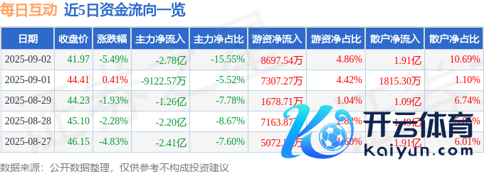 本站音问,领域2025年9月2日收盘,逐日互动(300766)报收于41.97元,下落5.49%,换手率11.72%,成交量41.97万手,成交额17.88亿元。 9月2日的资金流向数据方面,主力资金净流出2.78亿元,占总成交额15.55%,游资资金净流入8697.54万元,占总成交额4.86%,散户资金净流入1.91亿元,占总成交额10.69%。 近5日资金流向一览见下表: 逐日互动融资融券信息清晰,融资方面,当日融资买入1.4亿元,融资偿还2.0亿元,融资净偿还6040.35万元。融券方